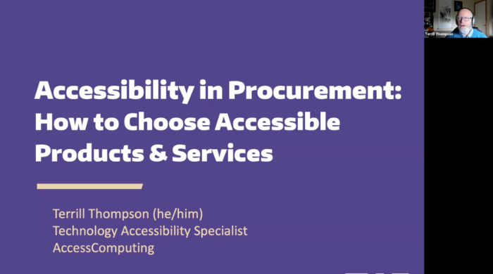 You're shopping for an online platform to use for a virtual conference you're organizing, or you're considering adopting a new technology for the courses you teach. You want, and may in fact be legally obligated, to ensure the product or service you choose is accessible to all users, including those with disabilities. How do you do that? This webinar will explore strategies for addressing accessibility at various stages within the procurement process. It will include extensive detail about technology accessibility standards, plus guidance on how to read a Voluntary Product Accessibility Template (VPAT), a standard form used by technology vendors to document their level of accessibility. Our speaker Terrill Thompson is manager of the IT Accessibility Team at the University of Washington, and technology accessibility specialist with AccessComputing. He has nearly thirty years of experience in the IT accessibility field.